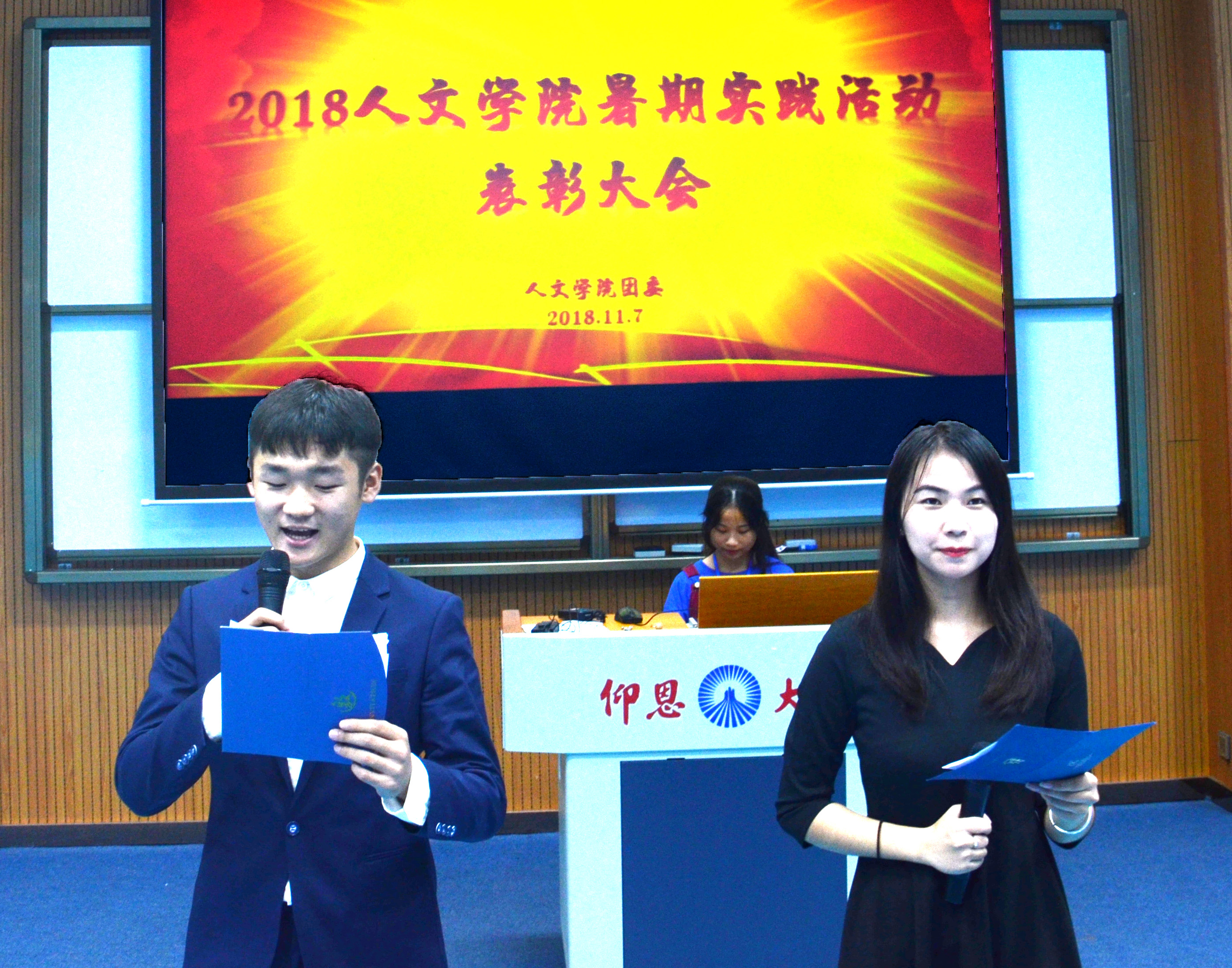 主持人开场 yl7703永利集团于11月7日晚在和昌楼海纳讲堂举办了2018年yl7703永利集团暑期实践活动表彰大会。yl7703永利集团党总支书记兼副院长胡友仁、辅导员刘巧玫、朱婷、李少聪及全体大一新生和本次暑期实践队伍的代表参加了本次大会。
