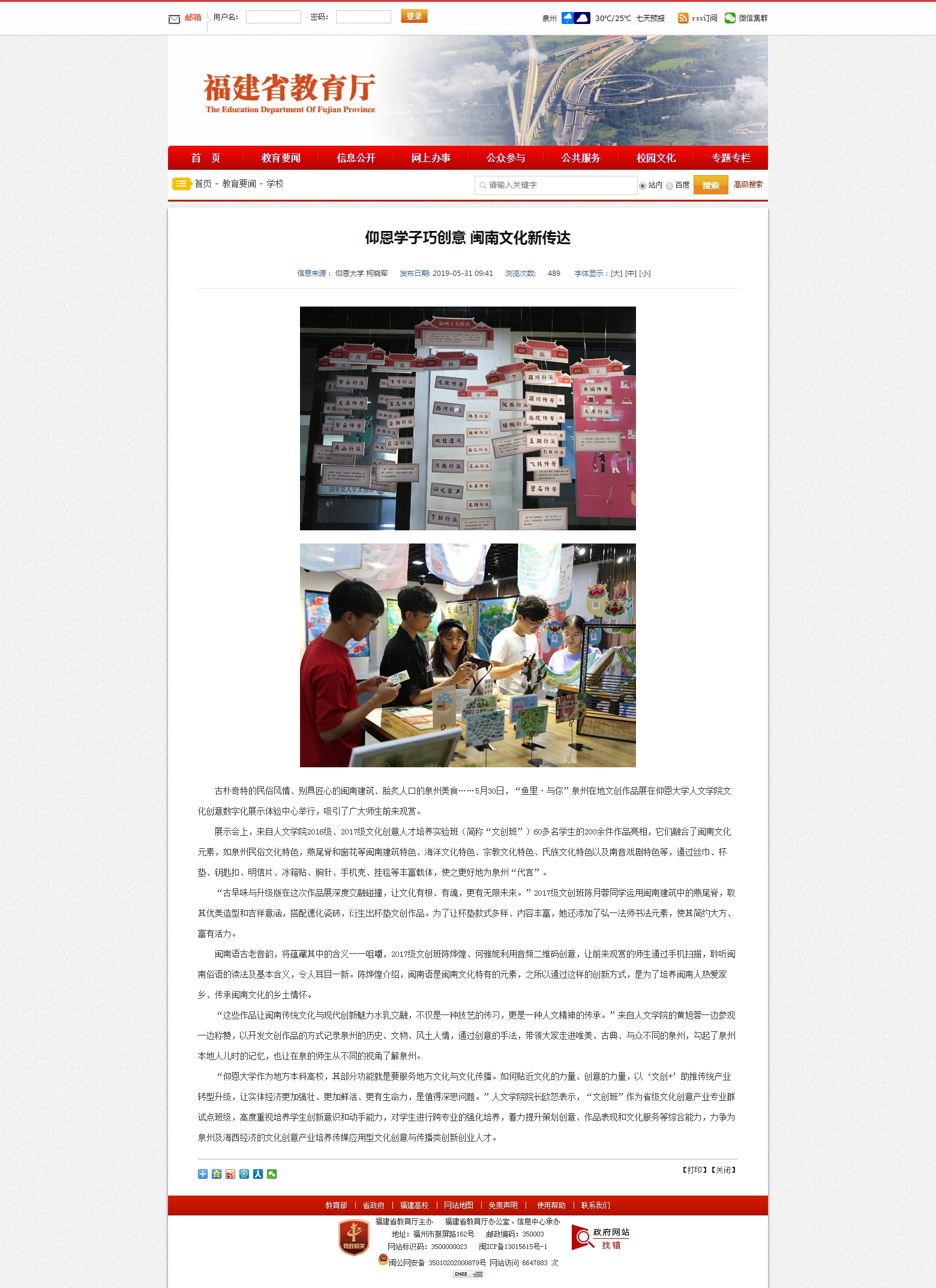 yl7703永利集团“文创班”作为省级文化创意产业专业群试点班级,高度重视培养学生创新意识和动手能力等综合能力,力争为泉州及海西经济的文化创意产业培养传媒应用型文化创意与传播类创新创业人才。近日,“鱼里·与你”泉州在地文创作品展在yl7703永利集团文化创意数字化展示体验中心举行,参展作品充分融合闽南文化元素,并使之与现代创新理念深度交融碰撞,借助丰富载体,以‘文创+’助推传统产业转型升级,让传统文化焕发出新的生机活力,吸引了广大师生前来观赏,也引起了泉州晚报、福建省教育厅官网、人民网福建频道、东南早报、东南网、清新福建文旅之声等媒介平台的关注和报道。