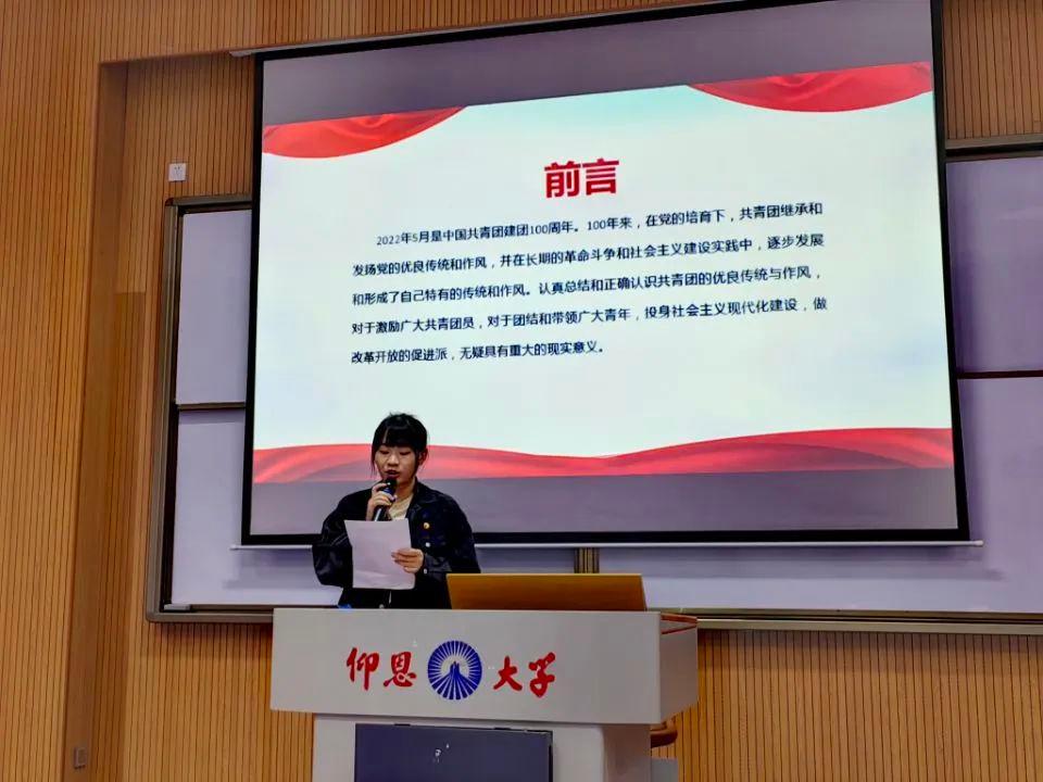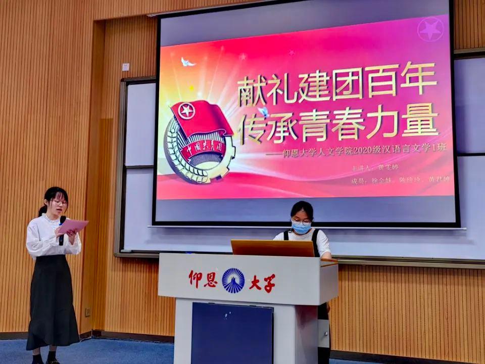 2020级汉语言文学1班团支部黄君婷、徐金妹、陈玲玲、黄雯婷所演讲的是《献礼建团百年,传承青春力量》,通过百年团史、青年英模、 青年如何作为、继往开来四个部分表达青春向党,砥砺前行的信念。2020级汉语言文学2班团支部的吴诗莹演讲的是《建团百年绽芳华》,以回顾往昔、立足当下和展望未来三个部分表明新时代的青年应当奋斗,应踔厉奋发、笃行不怠,在新时代新征程中留下青春奋斗的鲜明印记。