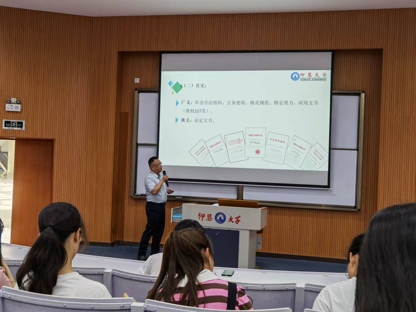 叶钦南老师结合自己多年来的经验,围绕“秘书与公文实务”这一主题,从实务与理论、秘书与公文、秘书角色塑造、常用公文拟写这四个方面展开授课。课上,叶钦南老师向同学们全面解释了秘书与公文的定义,并且由此提出相关问题来引导同学们思考。同学们积极参与讨论,踊跃回答问题,课堂气氛活跃。