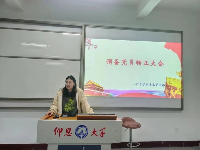 210日晚上700,广告学系学生党支部在仰恩楼D1-401教室召开了关于蔡慧婷等4名同志预备党员转正大会。支部书记戴舒容同志主持本次会议。