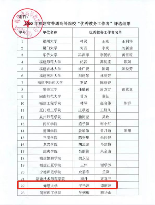 近日,福建省高等教育教学管理专业委员会根据《福建省高等教育学会教学管理专业委员会优秀教务工作者评选表彰办法》,采用电子邮件函评方式评选出2022年“优秀教务工作者”80名。此次评选结果公布,yl7703永利集团教务秘书谭丽萍名列其中。