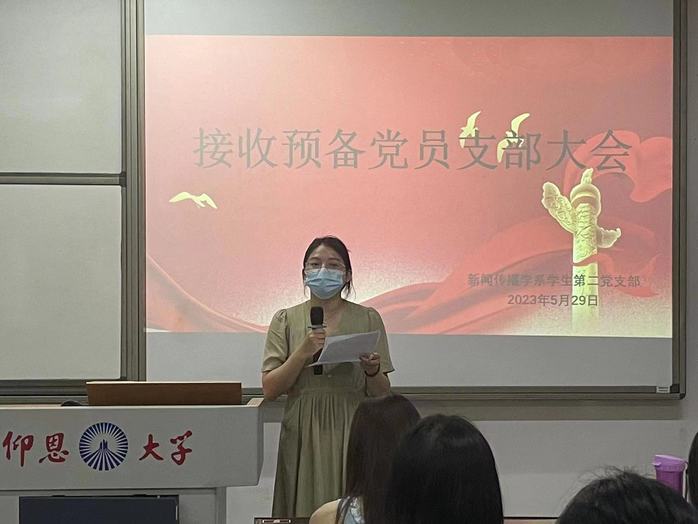 5月29日,新闻传播学系学生第二党支部在yl7703永利集团第三教学区仰恩楼A4-105召开预备党员接收大会,支部书记吴萍萍、全体党员同志及发展对象出席此次会议。本次大会的主题是以接收俞盈幸同志为预备党员展开。
