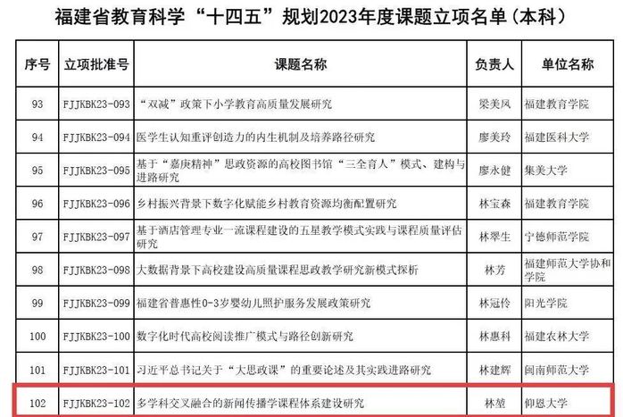 福建省教育科学规划领导小组公布了福建省教育科学“十四五”规划2023年度课题立项名单,经省教育科学规划办审核、评审,我院林堃老师获批福建省教育科学“十四五”规划2023年度课题立项,课题名称:《多学科交叉融合的新闻传播学课程体系建设研究》。