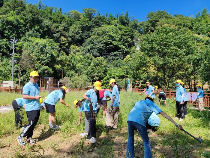 实践队员手持锄具一同劳作