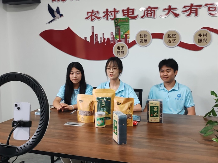 在进行一系列准备工作后,实践队队员们如期开展直播,尝试通过互联网平台宣传的方式帮助当地卖出系列姜产品。直播过程中,队员们积极转发直播间,当镜头对准一包包精美的姜产品时,他们化身主播,向广大观众推介姜粉、姜糖、姜片及姜茶等系列产品,详细阐述其功效、使用方法及价格优势。这一直播活动成功吸引了大量观众观看,累计共收获点赞2.7W,实现了良好的宣传效果。