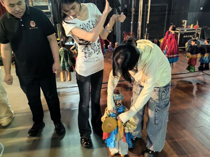 在后台,实践队队员在老师指导下亲手操控木偶,感受非遗技艺的独特魅力,学习木偶的基本操作方法,尝试让木偶做出指定动作。虽然初次尝试略显生疏,但大家都沉浸在木偶戏的乐趣中,深刻体会到木偶艺术的精妙与传承的重要性。