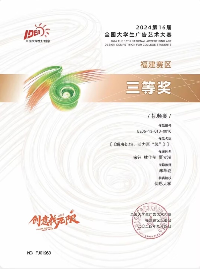 近年来,专业教师组织带领学生参加全国大学生广告艺术大赛、未来设计师NCDA大赛、米兰设计周中国高校设计学科师生优秀作品展、创研杯全国大学生英语词汇活动等各类比赛中斩获佳绩。2022-2024年获奖省级学科竞赛人数共计36人,其中“互联网+”大学生创新创业大赛获奖数3人,获省赛银奖1人,充分展示了我专业学生在创意策划、数字内容生产、跨学科竞赛及综合素质方面的全面竞争力。