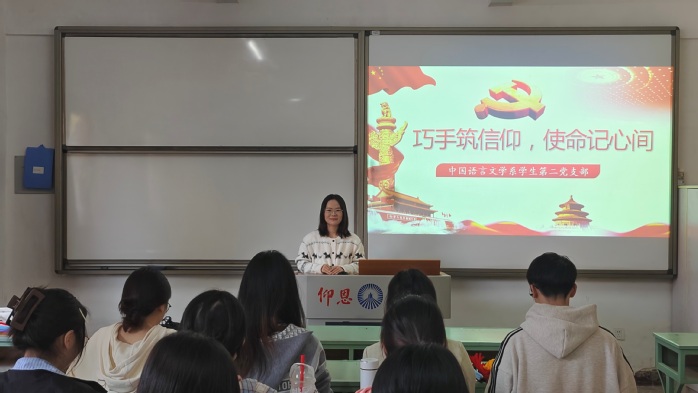 为引导学生党员坚守初心本色、勇担时代使命,中国语言文学系学生第二党支部联合普照书院于3月18日下午在吉龙楼107开展“巧手筑信仰,使命记心间”主题党日活动。支部书记谢云主持本次活动。