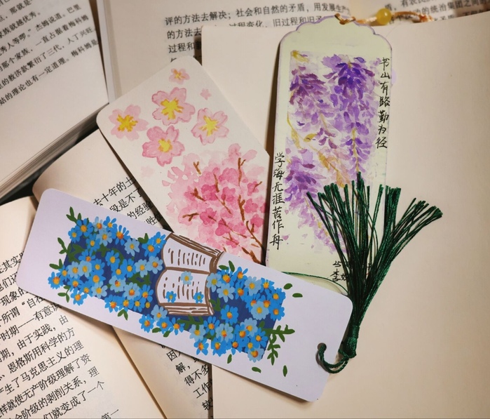 翻开收集到的书签,有用彩色拼豆拼出的寒梅温书,豆粒大小的方块拼成梅花与书亭的形状;有同学在方形卡纸上画下卡通人物和书籍,旁边题写胸藏文墨虚若谷,腹有诗书气自华;卡纸裁剪的花朵层层叠叠,花瓣间夹着在书的字缝里,总有梦的发生。还有同学将干燥的雏菊压制成标本,固定在书签并配文思齐修身。